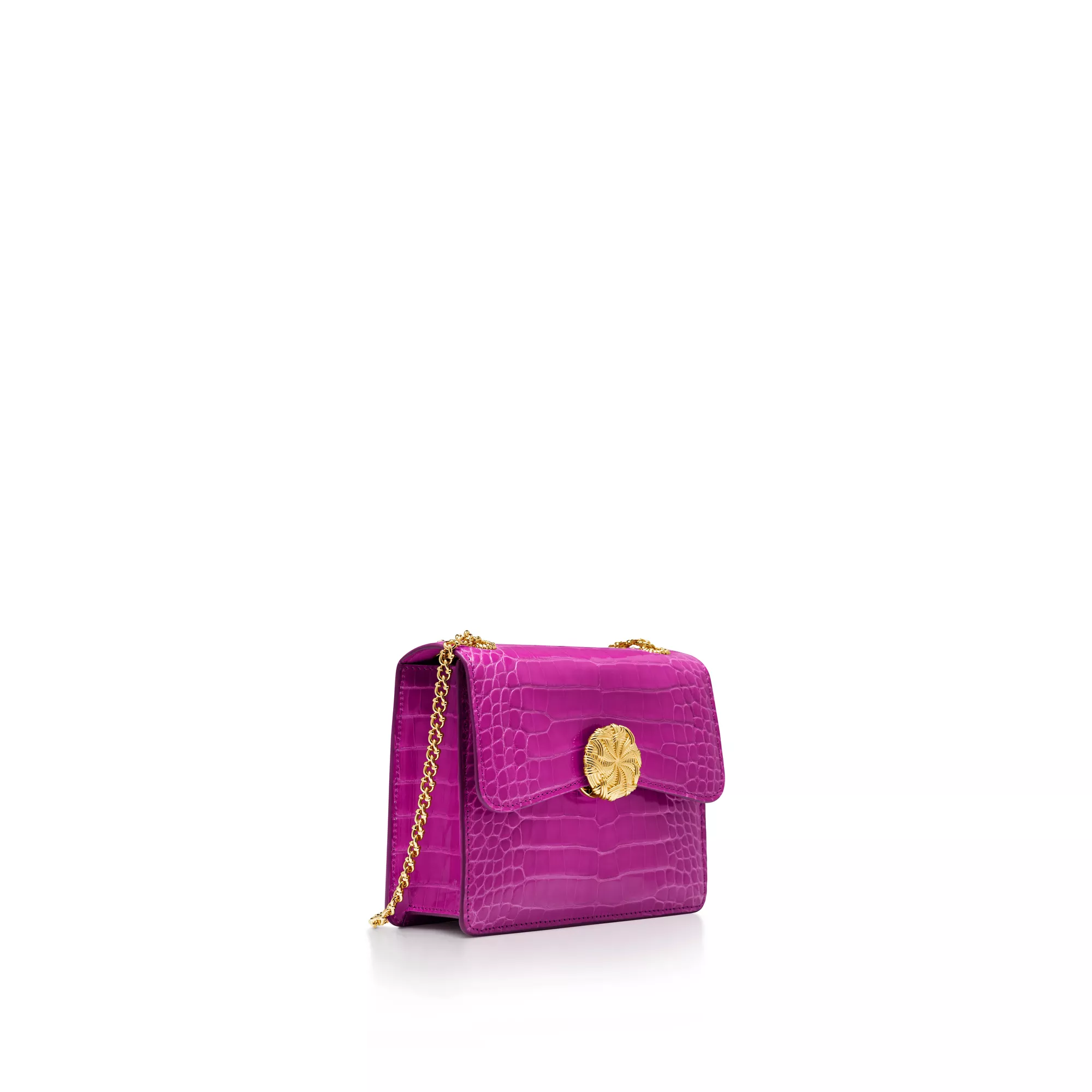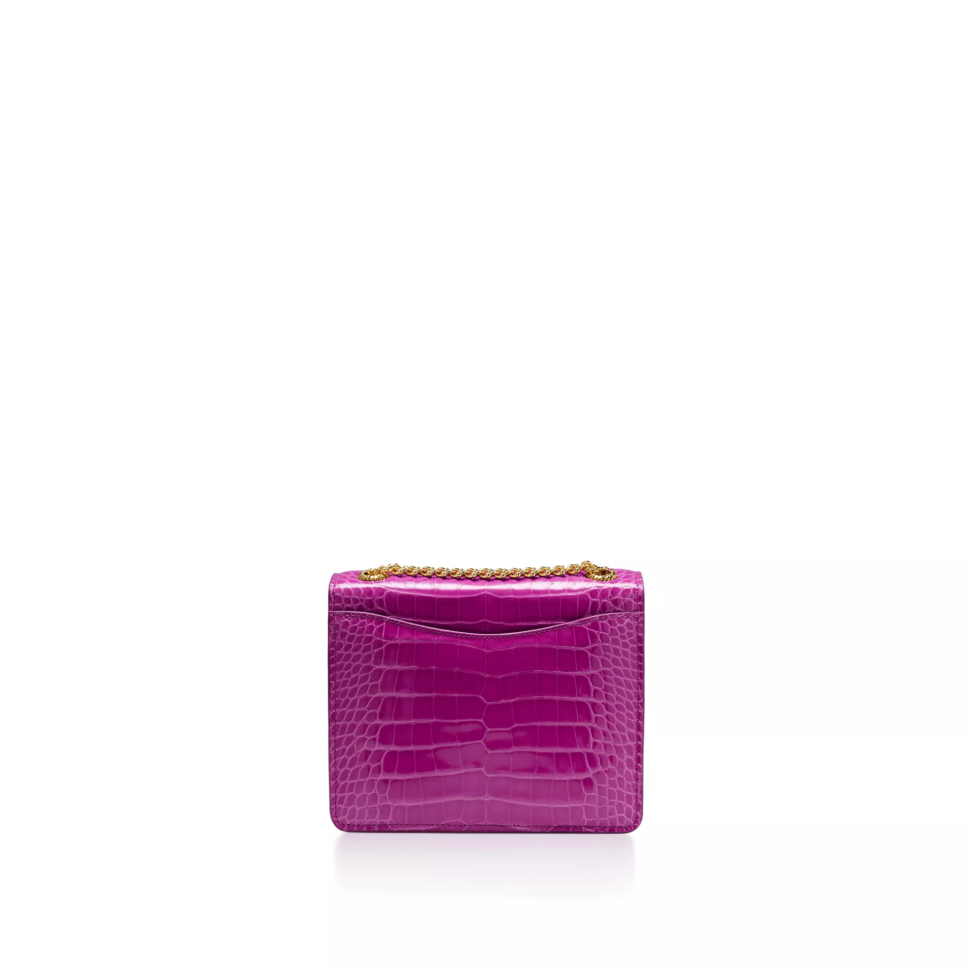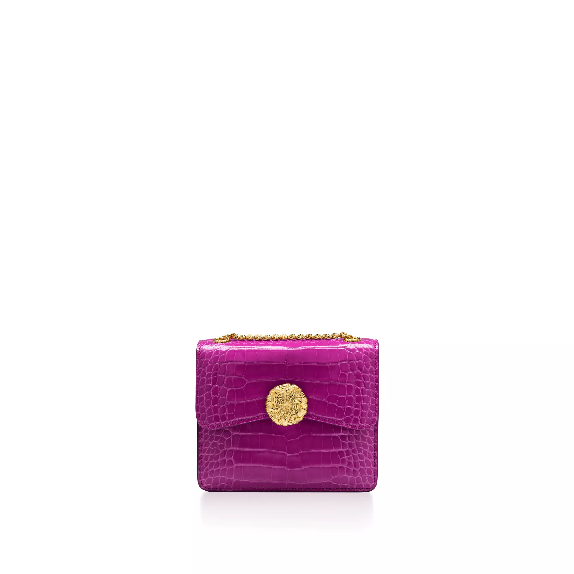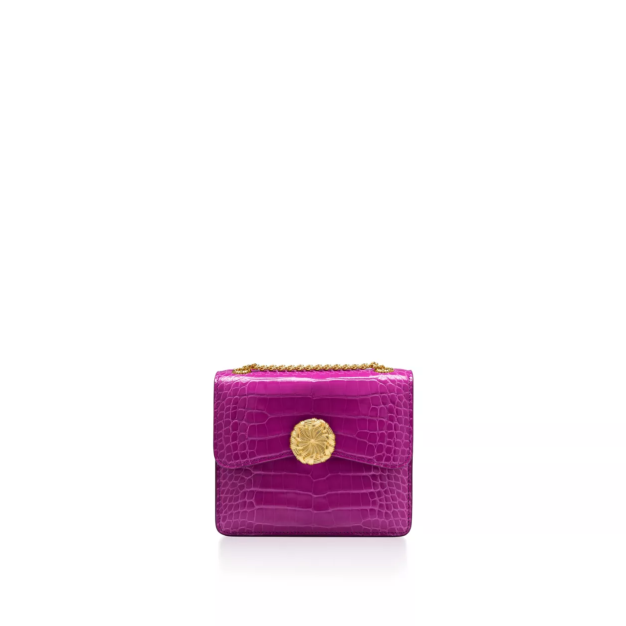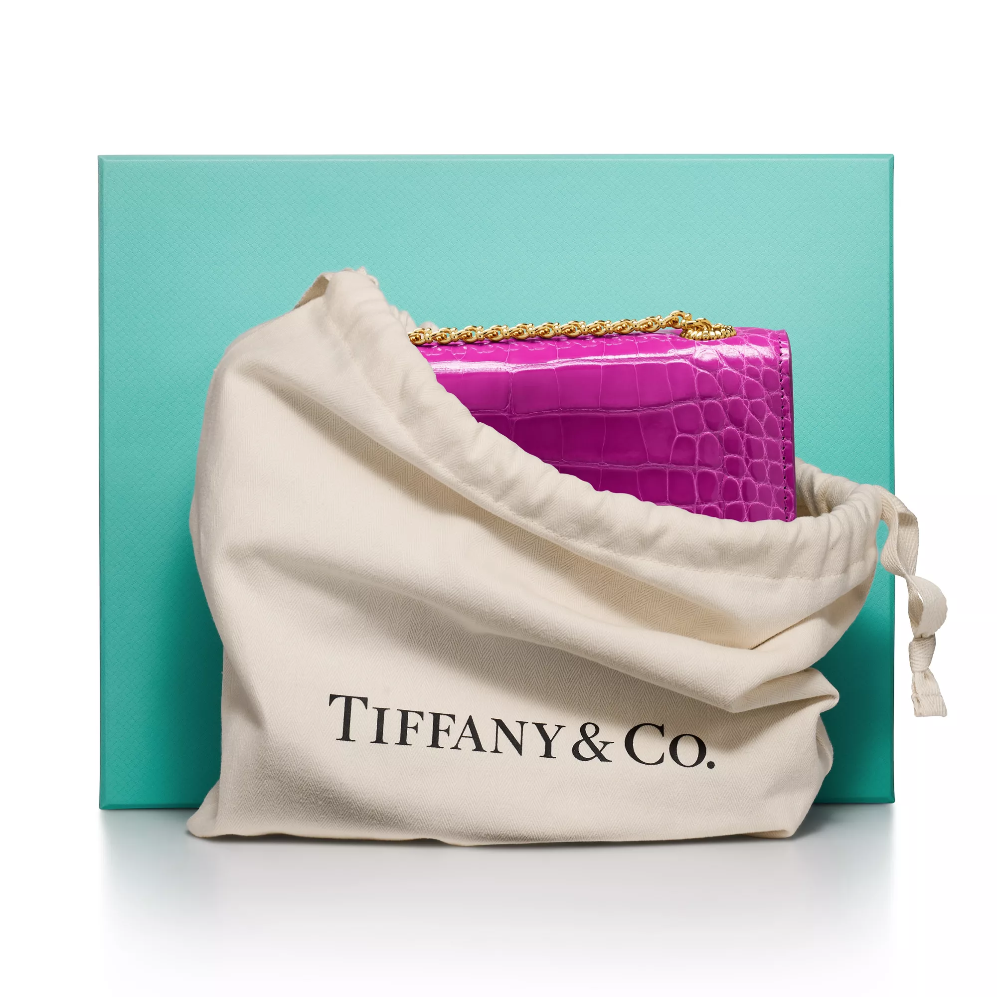 The Jean Schlumberger by Tiffany Ribbons collection is inspired by the legendary designer’s family history in the textile industry and the ornate trim he frequently incorporated into his creations. Crafted from alligator leather, this bag features a front slip pocket lined with Tiffany Blue® and an interior back pocket with a removable mirror. The gold-plated brass closure nods to a motif seen on a compact mirror designed by Jean Schlumberger in 1957.