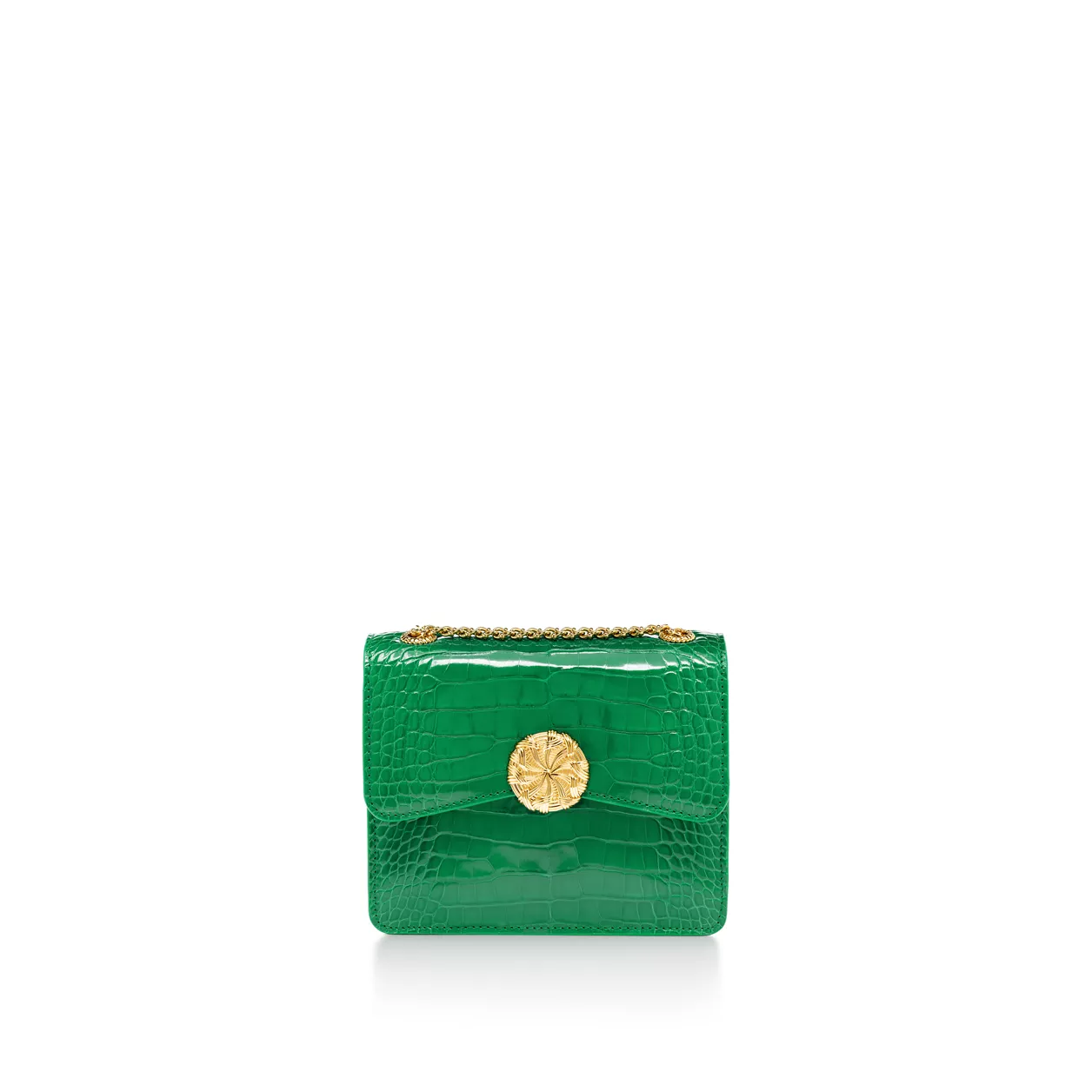 The Jean Schlumberger by Tiffany Ribbons collection is inspired by the legendary designer’s family history in the textile industry and the ornate trim he frequently incorporated into his creations. Crafted from alligator leather, this bag features a front slip pocket lined with Tiffany Blue® and an interior back pocket with a removable mirror. The gold-plated brass closure nods to a motif seen on a compact mirror designed by Jean Schlumberger in 1957.