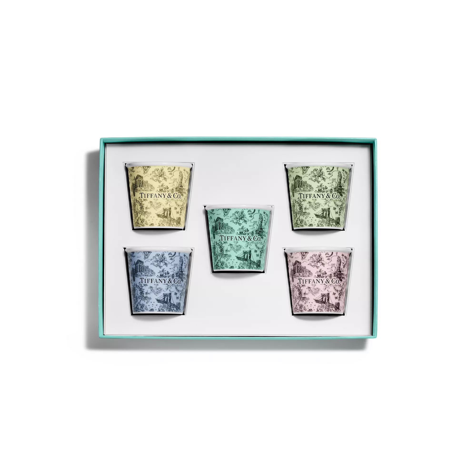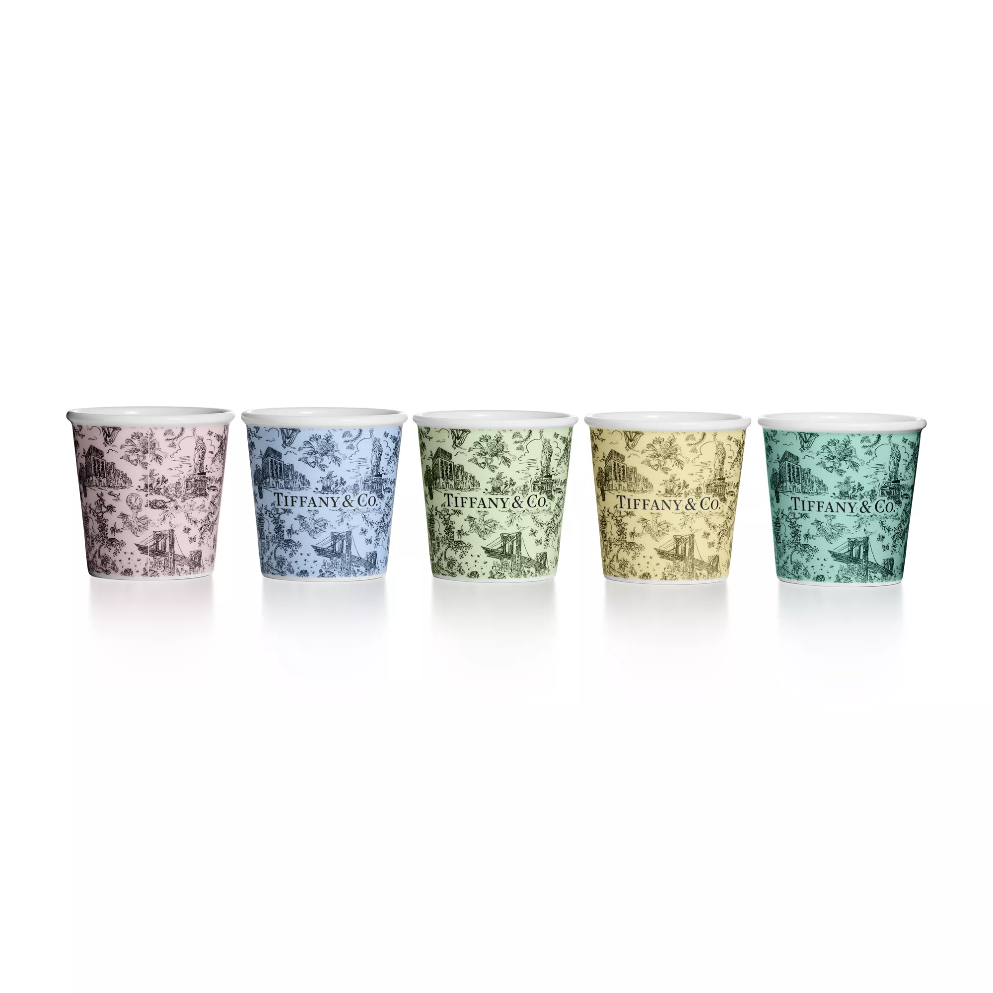 Tiffany Toile designs are a whimsical tribute to Tiffany's hometown and its heritage. Playful yet elegant, the artwork is inspired by an illustration of New York City from The Tiffany Archives. The Brooklyn Bridge meets Bird on a Rock; the Statue of Liberty mingles with a Tiffany & Co. diamond. This multicoloured espresso cup set features the elaborate print on bone china.