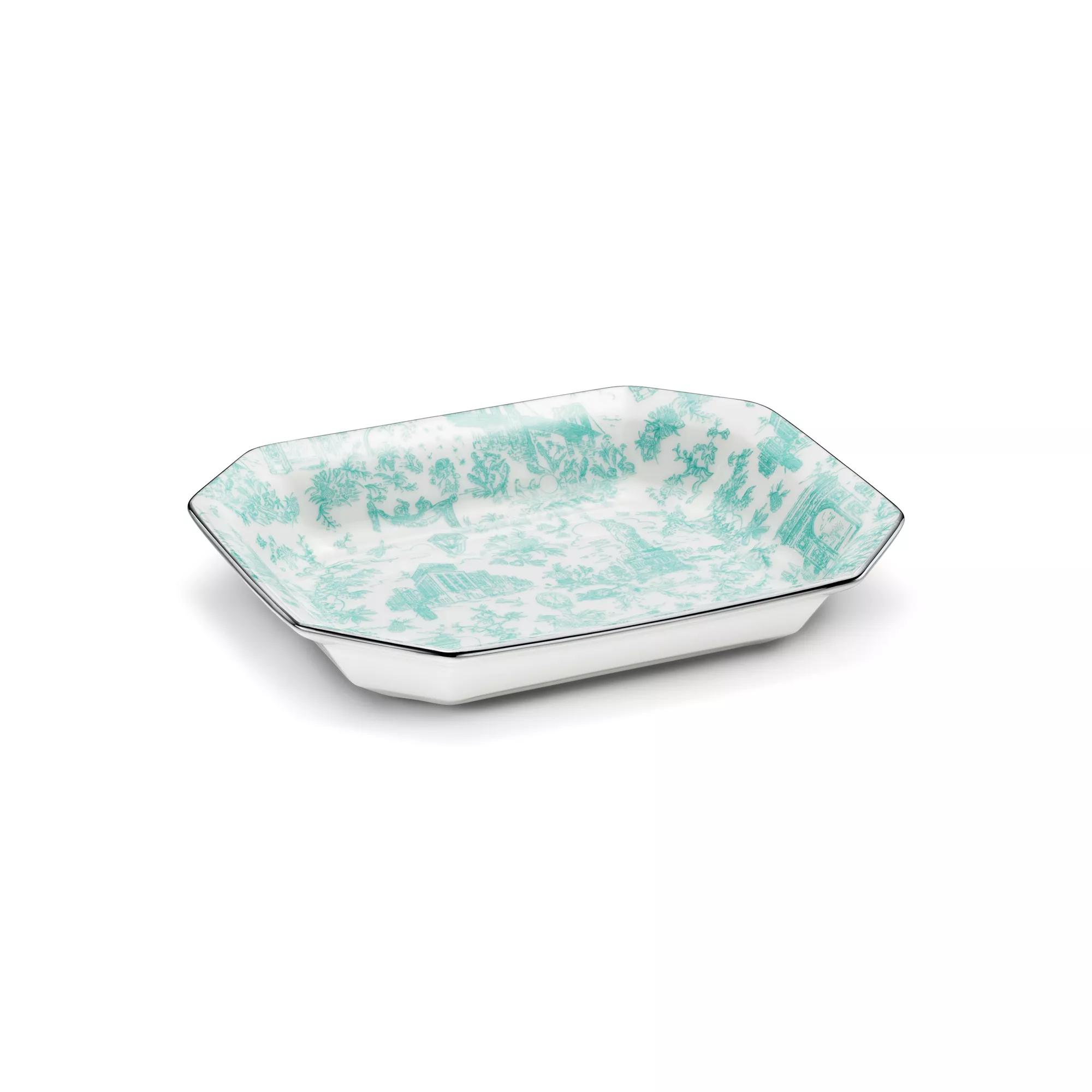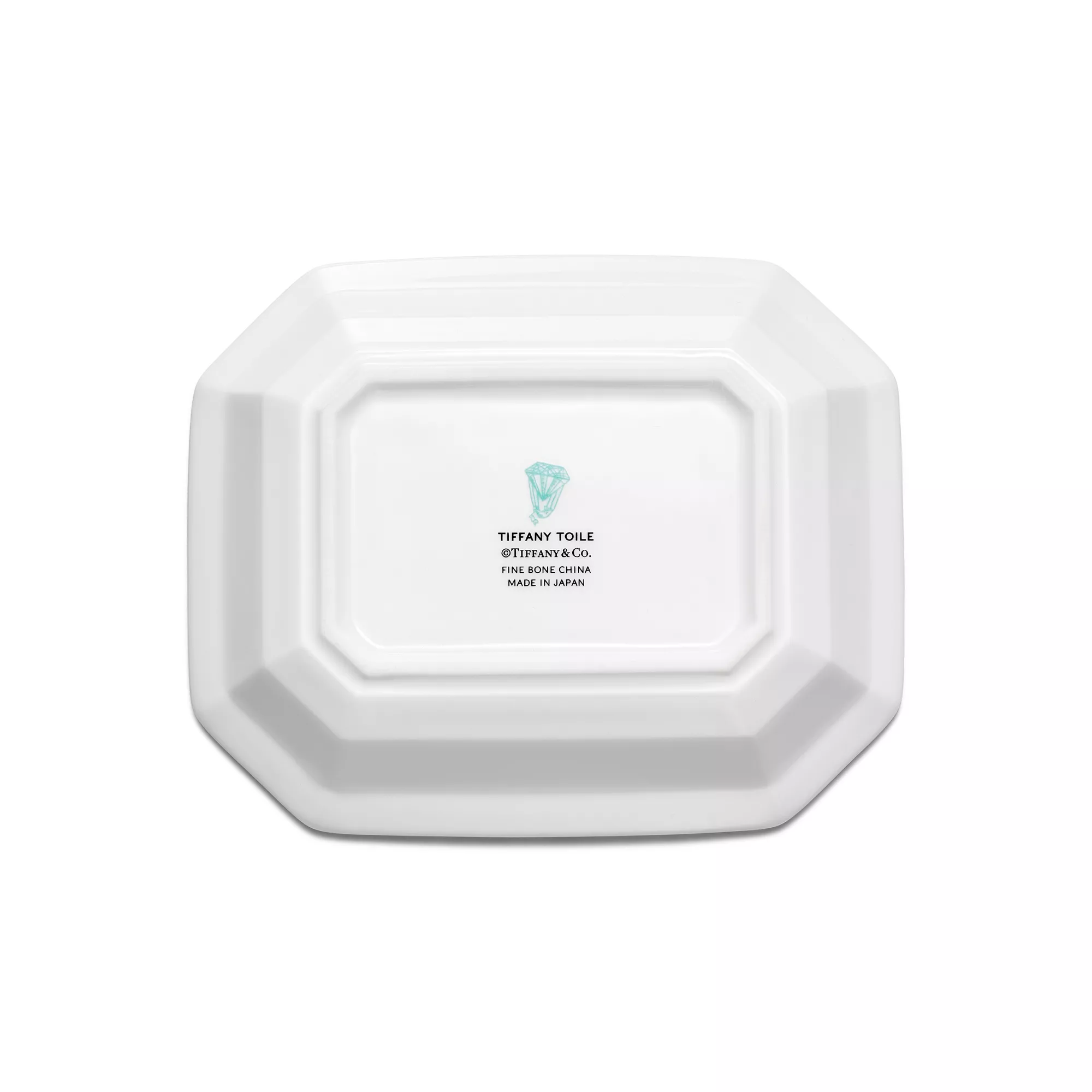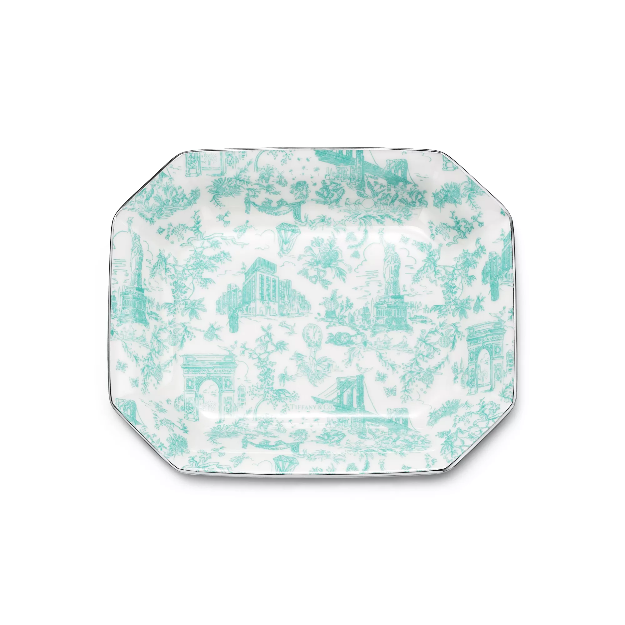 Tiffany Toile designs are a whimsical tribute to Tiffany's hometown and its heritage. Playful yet elegant, the artwork is inspired by an illustration of New York City from The Tiffany Archives. The Brooklyn Bridge meets Bird on a Rock; the Statue of Liberty mingles with a Tiffany & Co. diamond. This Tiffany Blue® vide poche features the elaborate print with a hand-painted platinum rim.