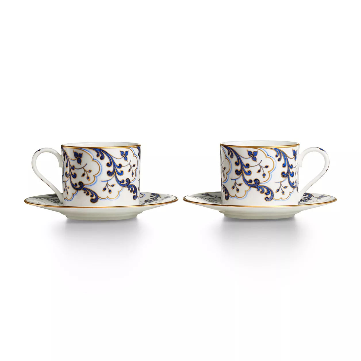 Luxurious and timeless, Valse Bleue designs showcase an elegant floral motif. The unique pattern is an ode to 1960s tableware from The Tiffany Archives. Crafted from bone china, each Valse Bleue creation is finished with hand-painted gold edges—further elevating the exceptional design. Mix these teacups and saucers with other pieces in the collection to complete your table setting.