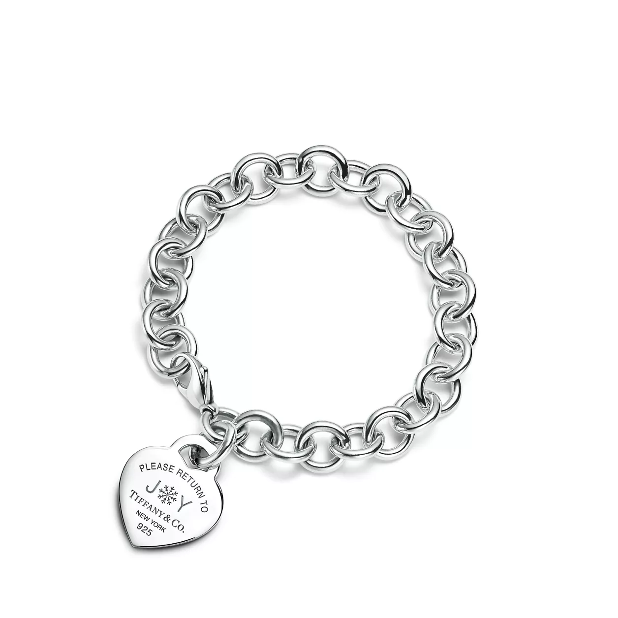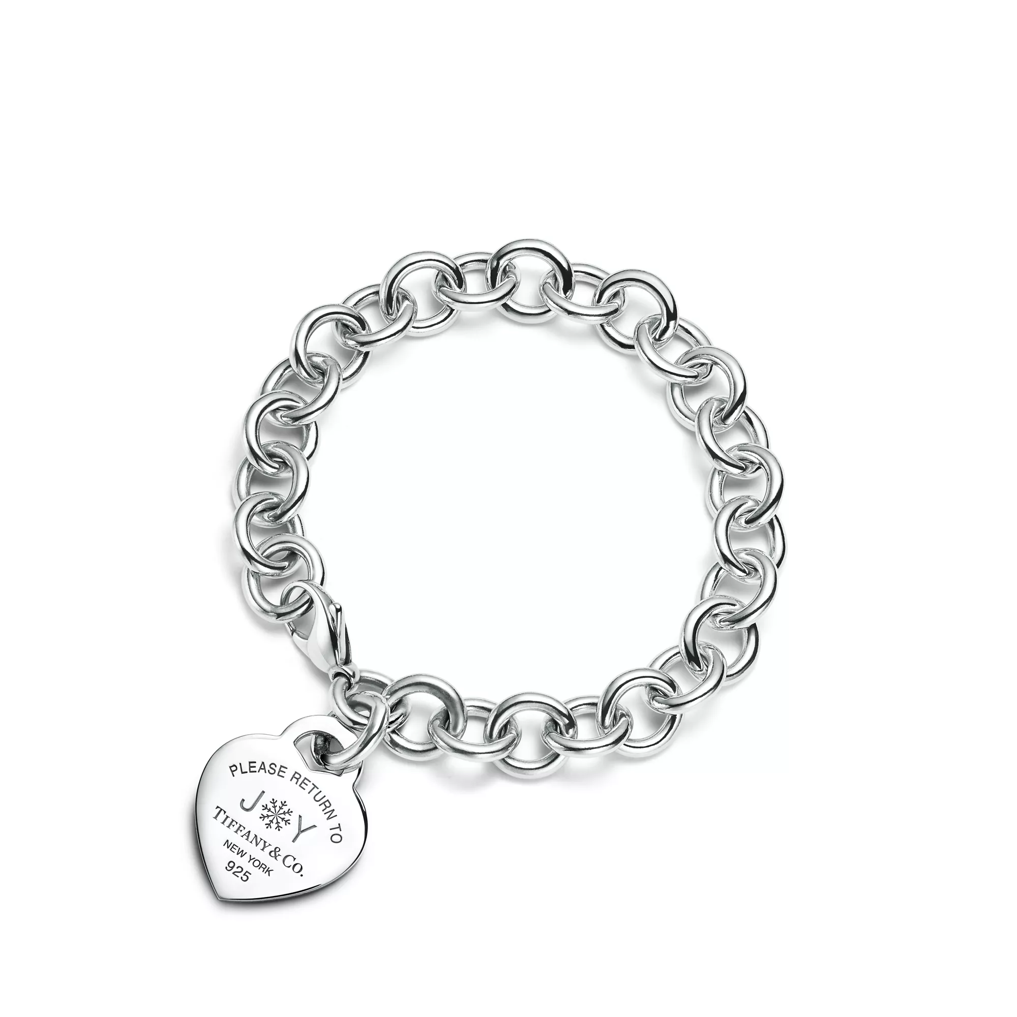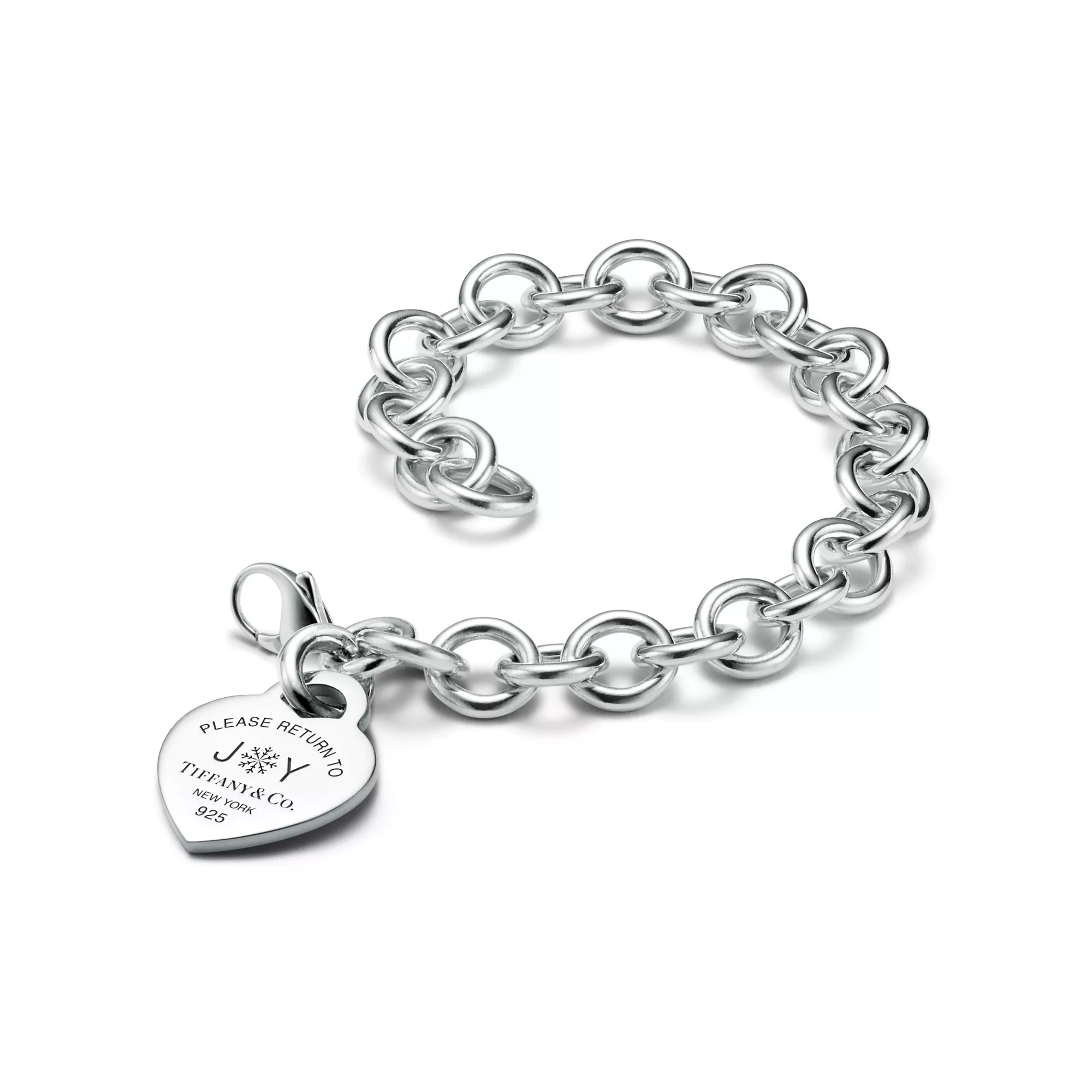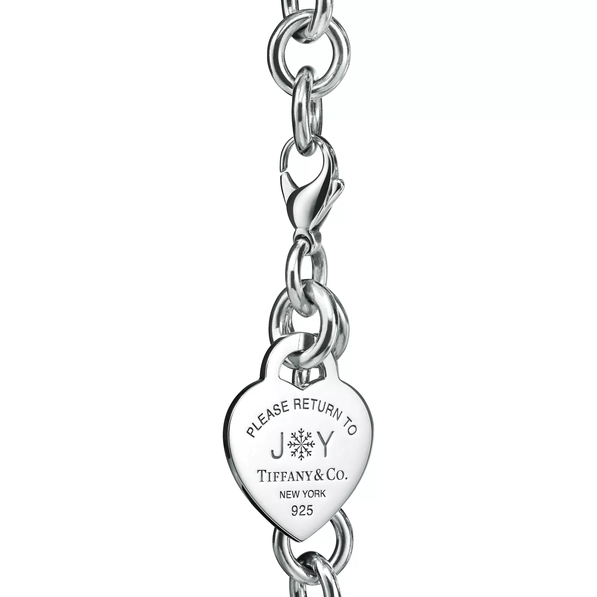 Inspired by the iconic keyring first introduced in 1966, the Return to Tiffany™ collection is a classic reinvented. This heart tag bracelet, specially designed for Christmas, features the word "joy" and a snowflake accent, available exclusively at The Landmark and on Tiffany.com. Wear this bracelet by itself or mix with your everyday bracelet stack.