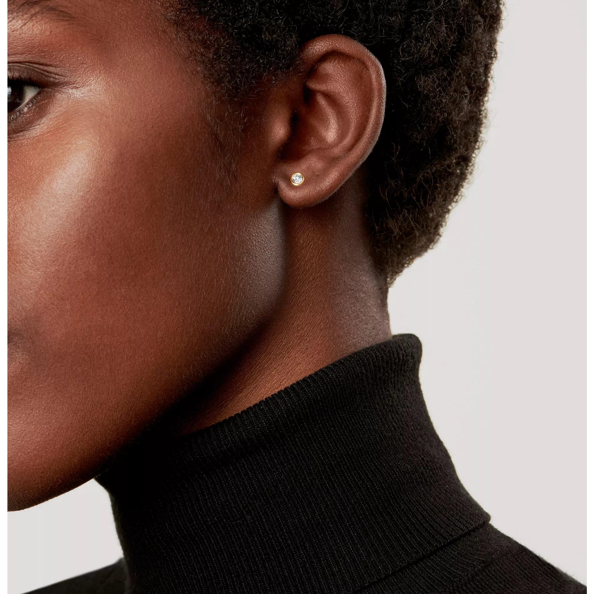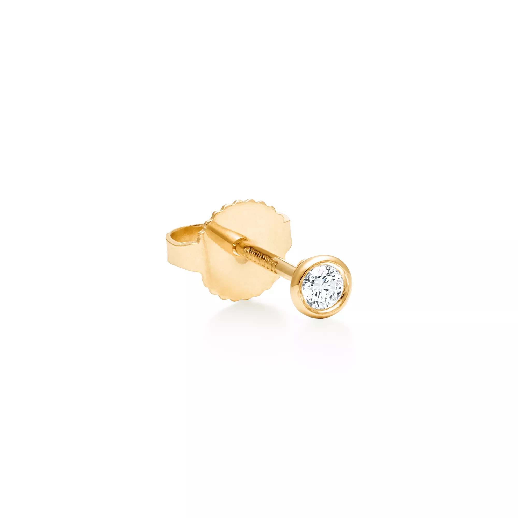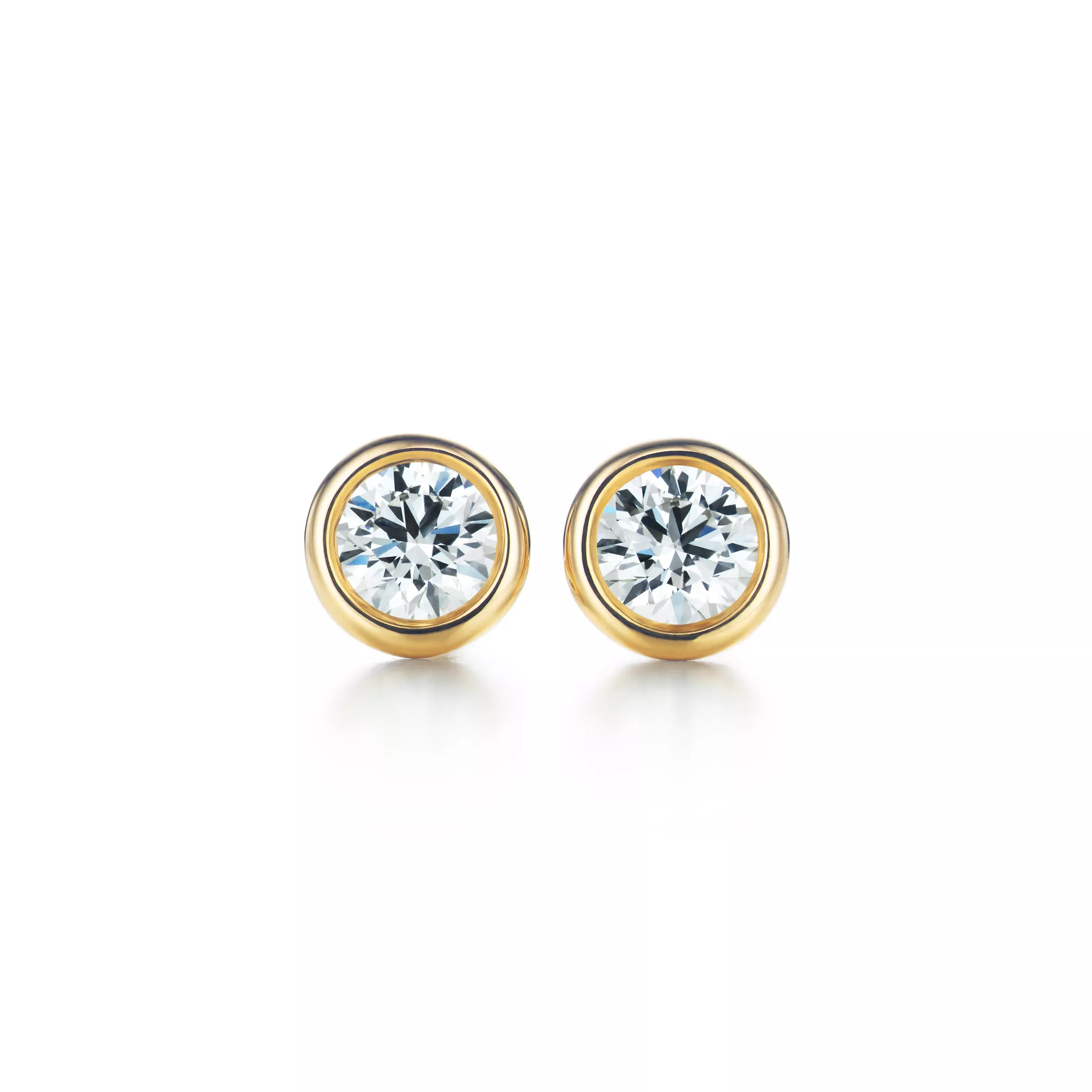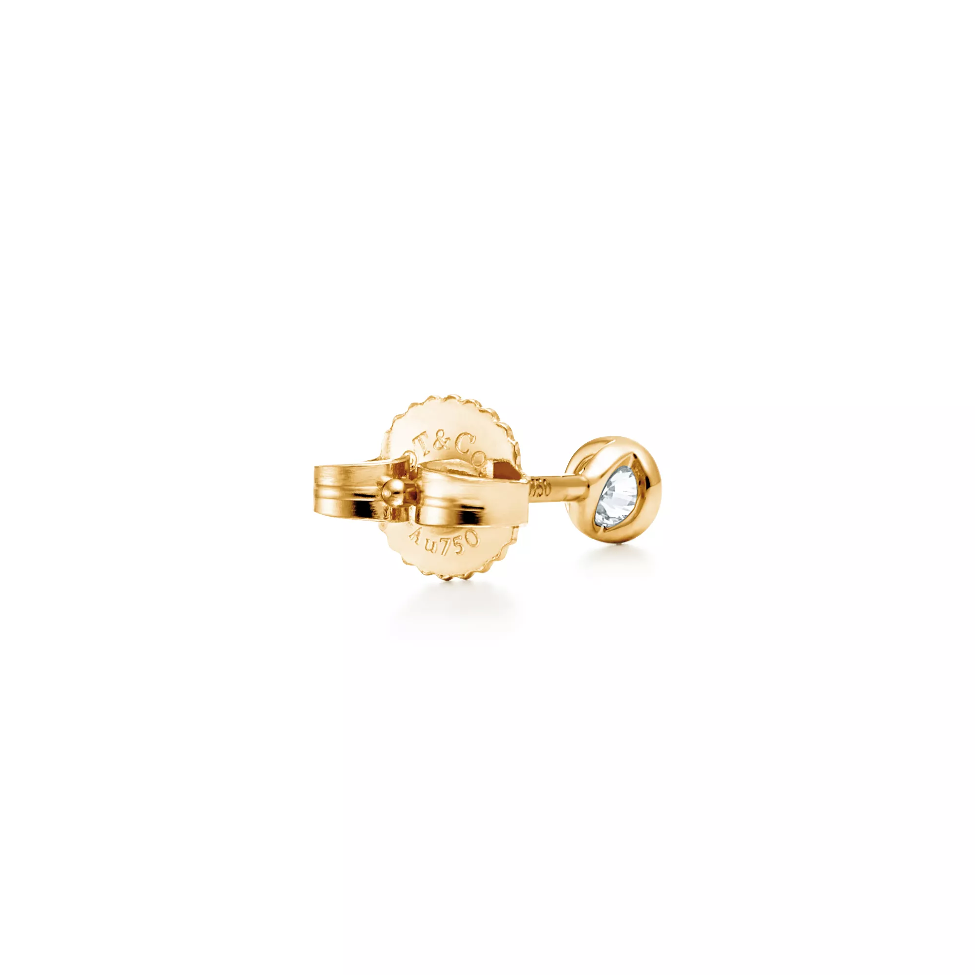 Tiffany round diamonds catch the light and make it dance. Earrings in 18k gold with round brilliant diamonds. Carat total weight .16. Original designs copyrighted by the Nando and Elsa Peretti Foundation.