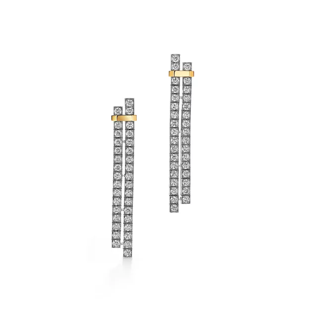 Reimagining diamond jewellery from a contemporary point of view, the Tiffany Edge collection is defined by a signature 18k yellow gold accent that joins together multiple rows of round brilliant diamonds. A balance of clean lines and showstopping diamonds, these Tiffany Edge drop earrings feature a striking contrast of precious metals. For maximum impact, wear these long drop earrings on their own.