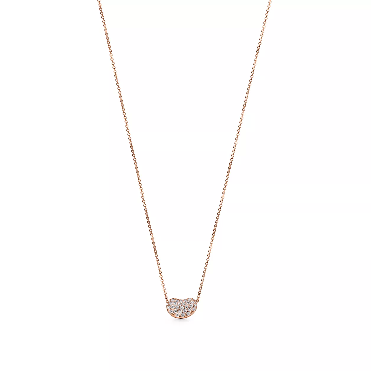 The bean represents the origin of all things. Pendant in 18k rose gold with pavé diamonds, 12 mm wide. On a 16" chain. Carat total weight .40. Original designs copyrighted by the Nando and Elsa Peretti Foundation.
