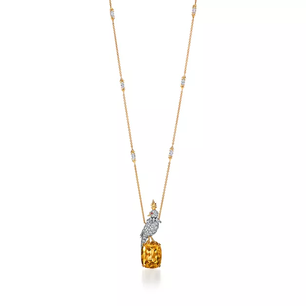 Bird on a Rock is one of the House’s most emblematic creations. Created by Jean Schlumberger for Tiffany & Co. in 1965, the diamond-encrusted bird is a symbol of joy, optimism and wonder. Today, the celebrated brooch transforms into an array of pendants. Epitomising the unrivaled craftsmanship for which Tiffany is known, every gemstone for each Bird on a Rock is hand selected and hand set by our artisans. This 18k yellow gold and platinum pendant features a bird set with diamonds and pink sapphires on a cushion-cut citrine "rock."