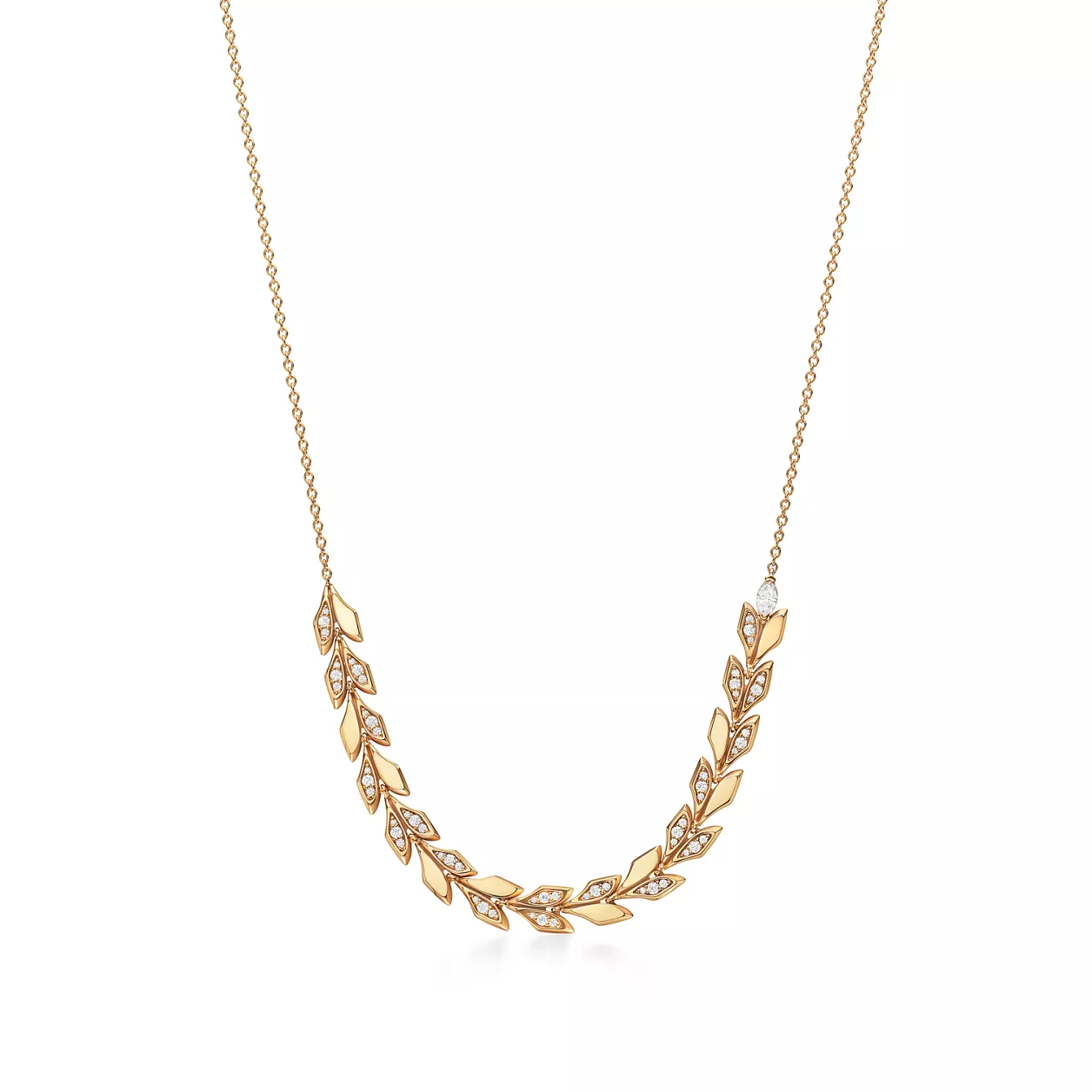 Inspired by the natural world, Tiffany Victoria designs capture the fluid movement of flowers, vines and leaves with a mix of expertly cut diamonds. This striking pendant is crafted of 18k gold that features a contrast of high polish and sandblasted finishes. Round brilliant and marquise diamonds play off the light and accentuate the vine motif. When too many diamonds are never enough, Tiffany Victoria is the ultimate way to shine. Wear on its own for a dramatic statement or layer with pendants of different lengths.