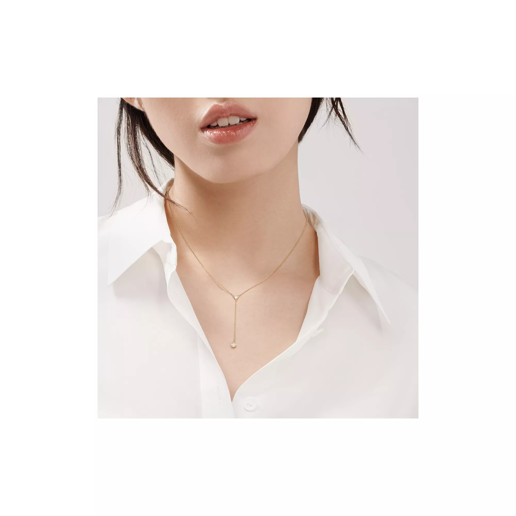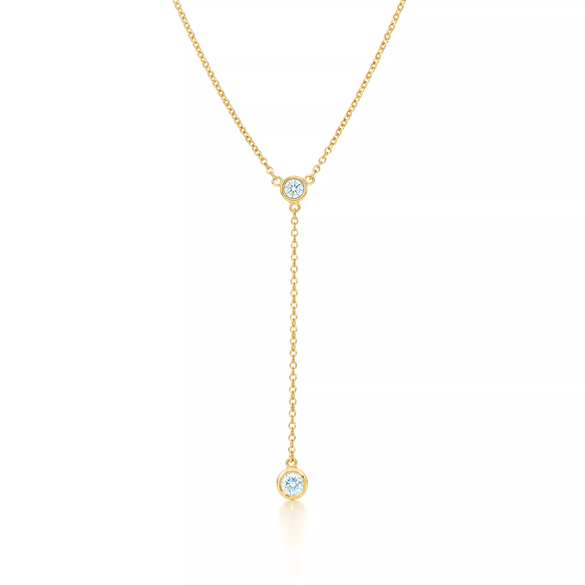 Tiffany round diamonds catch the light and make it dance. Necklace in 18k gold with two round brilliant diamonds. 16" long. Carat total weight .19. Original designs copyrighted by the Nando and Elsa Peretti Foundation.