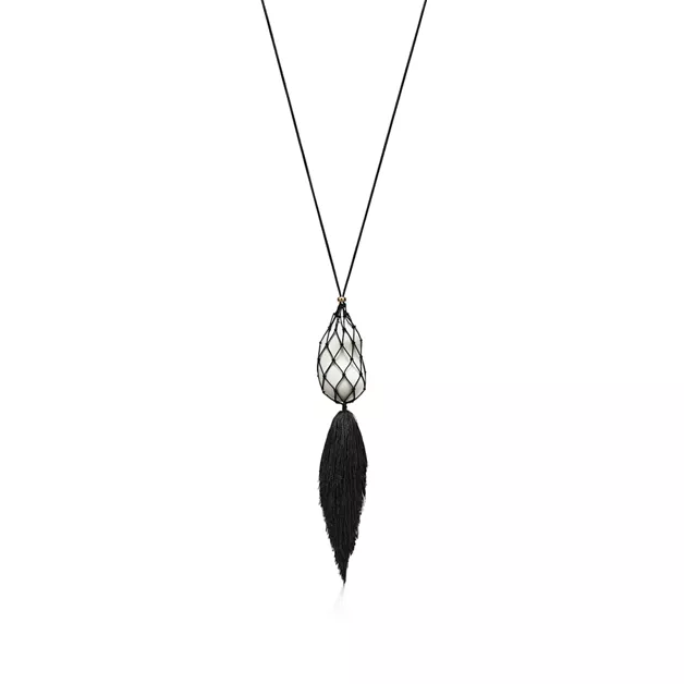 White finish over hand-carved sterling silver with black handwoven silk