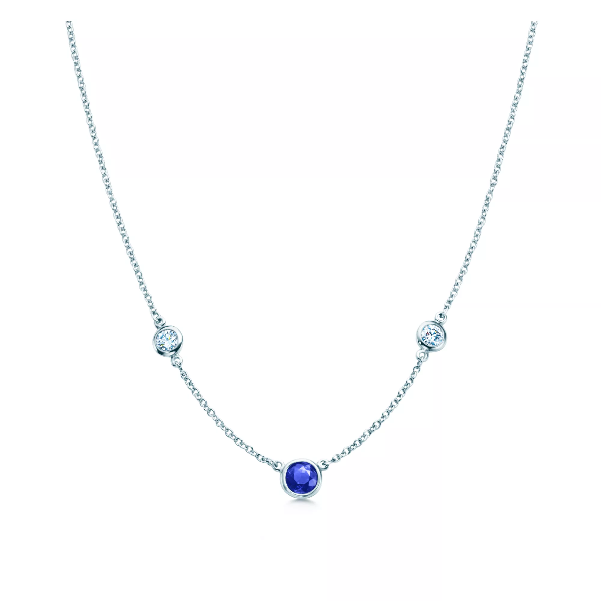 Necklace in platinum with round brilliant diamonds and a round sapphire. 16" long. Diamonds, carat total weight .16; sapphire, carat weight .30. Original designs copyrighted by the Nando and Elsa Peretti Foundation.