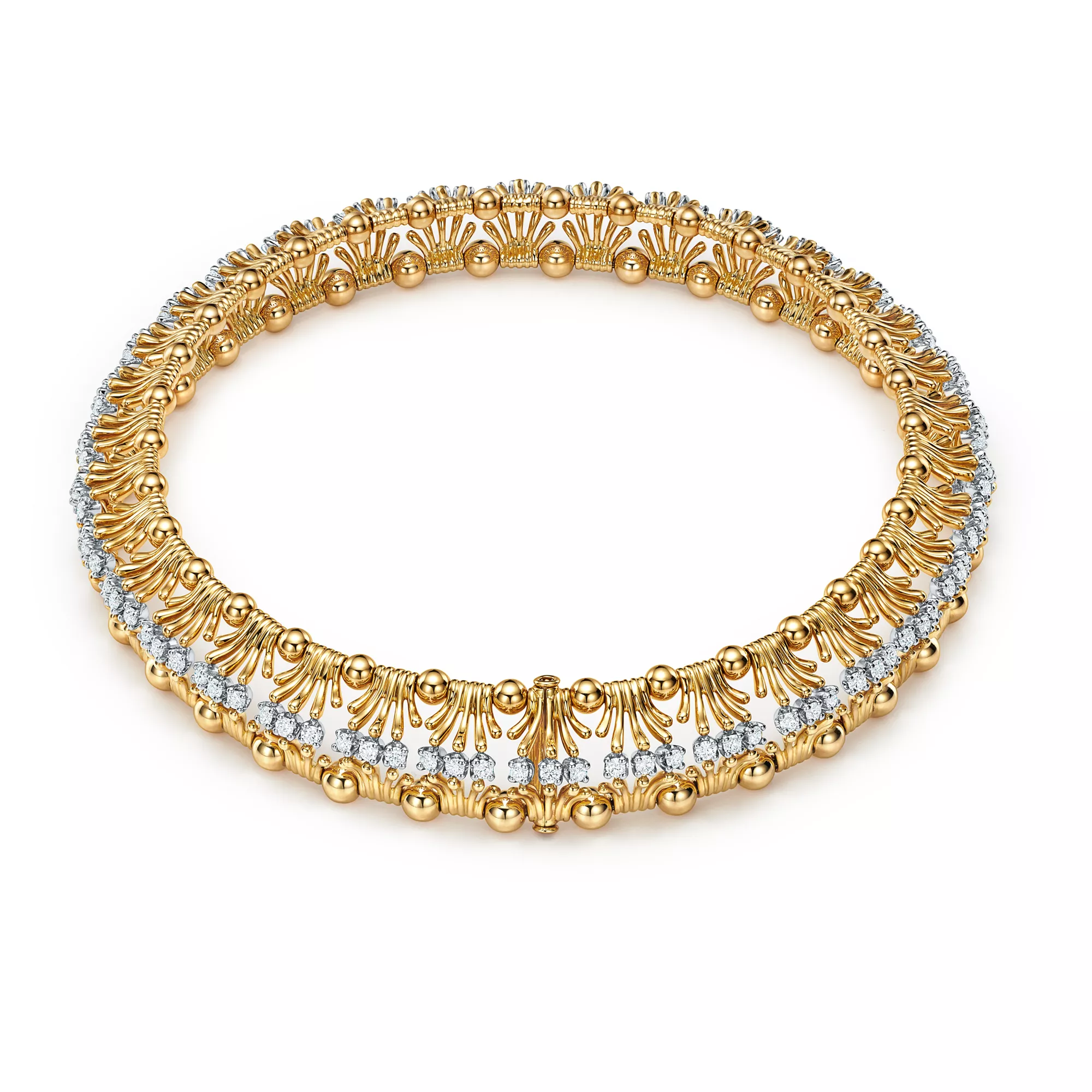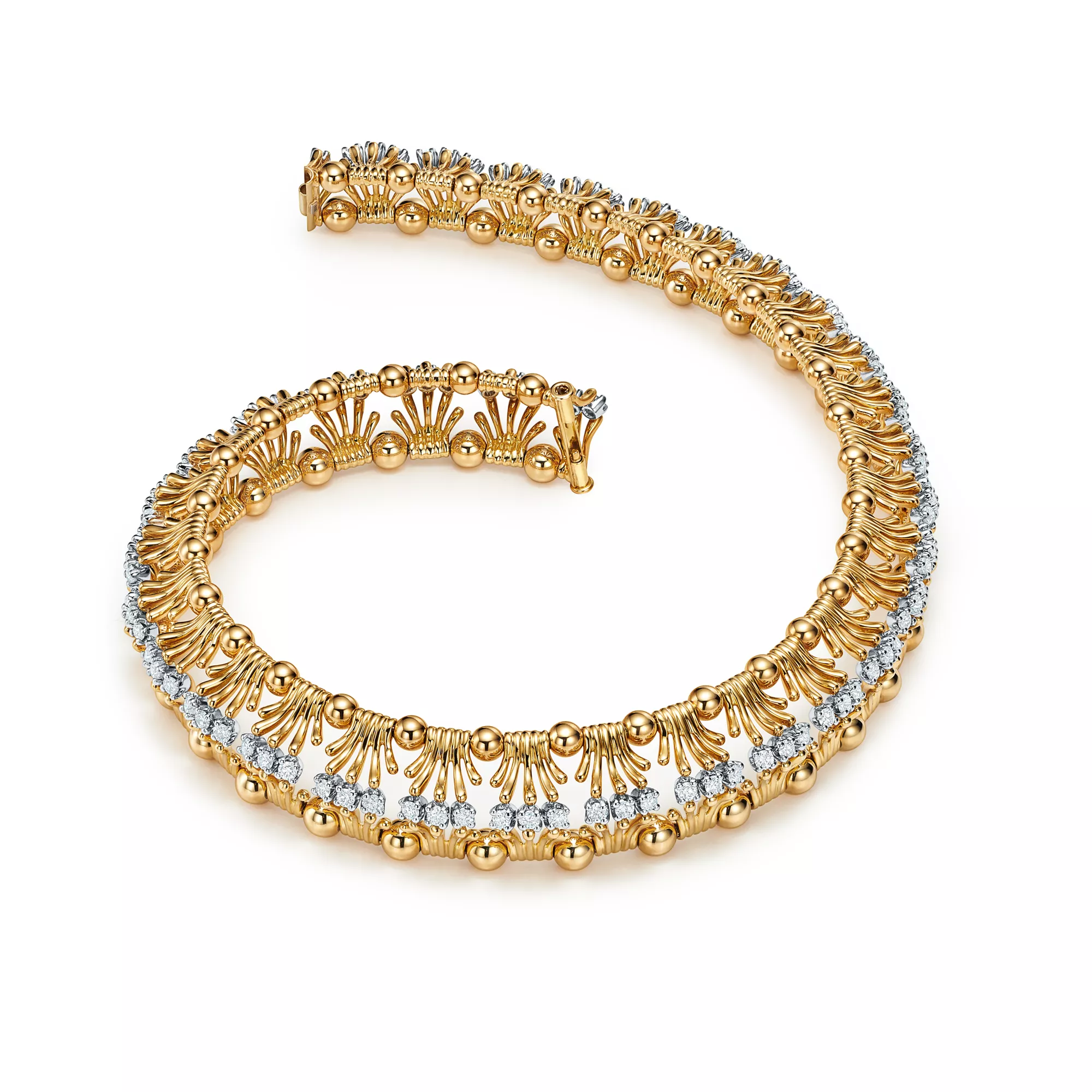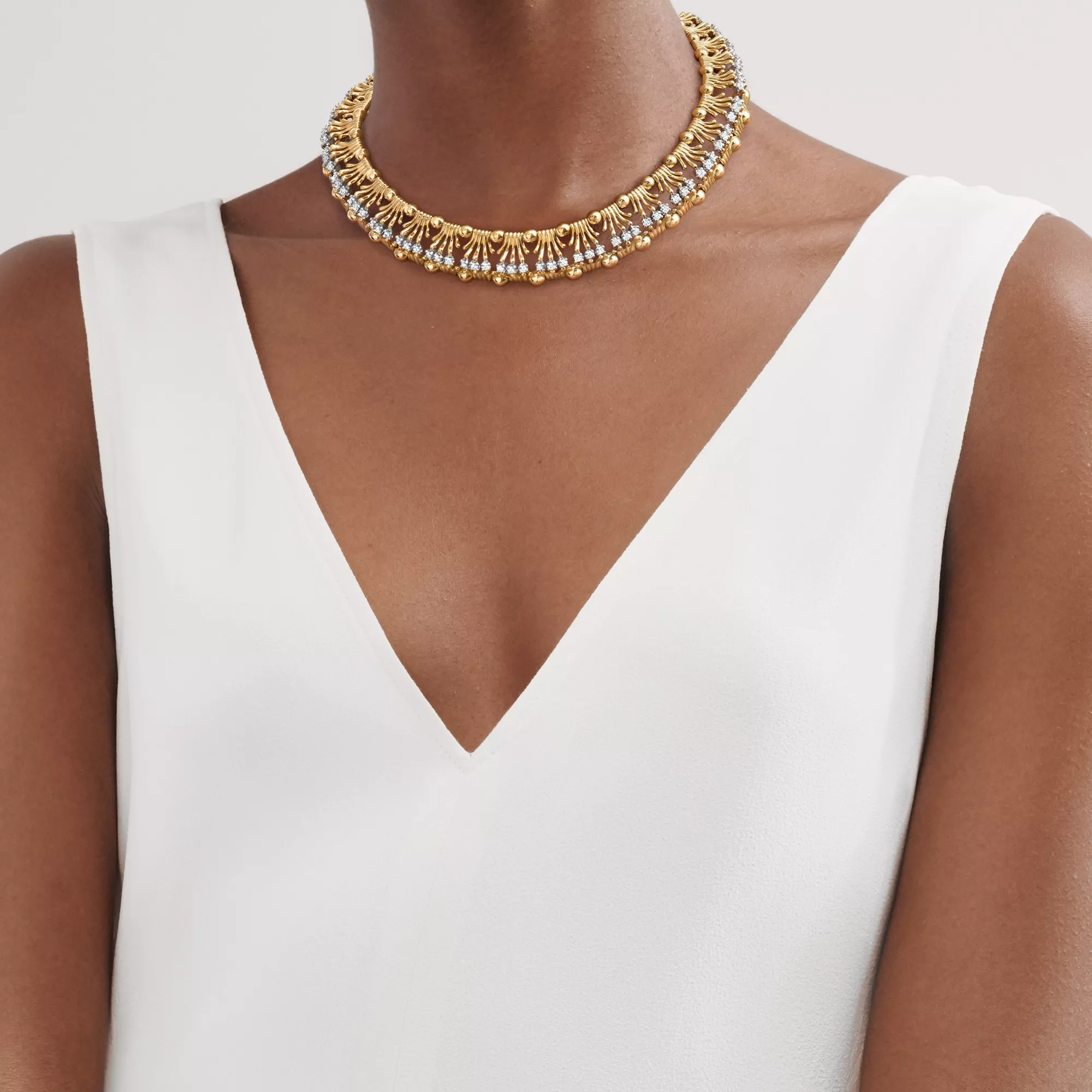 As one of the 20th century’s most gifted artists, Jean Schlumberger’s visionary creations are among the world’s most intricate designs. Born into a prominent family of textile merchants in Alsace, France, his self-taught early beginnings influenced some of his greatest creations. This Hands necklace creates an uninterrupted focus on the diamonds in the centre of the piece. Woven in a lyrical manner, the texture created by the 18k yellow gold "hand" elements strikes a perfect balance between elegance and refinement.