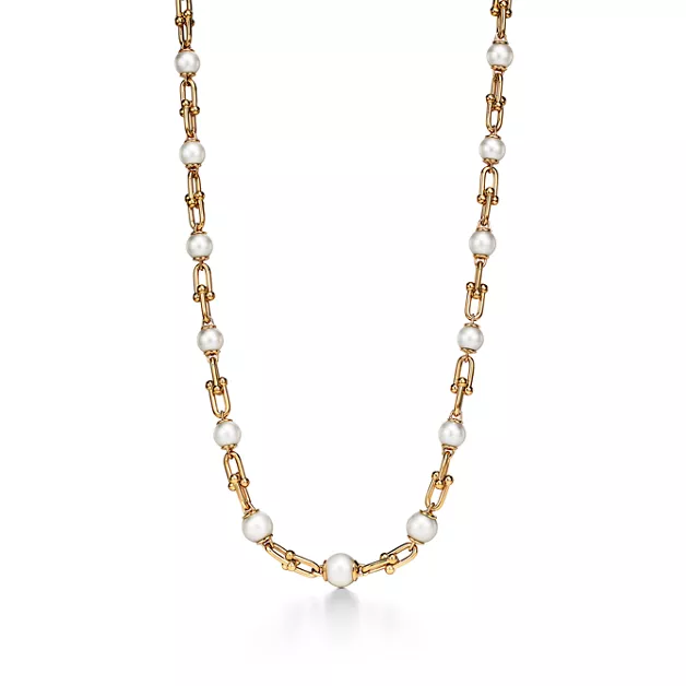 Tiffany HardWear is an expression of love’s transformative strength. Inspired by a quintessential bracelet from 1962 found in the House’s archives, HardWear embodies enduring resilience and uninhibited spirit. This 18k yellow gold necklace features the collection’s signature gauge links with freshwater pearls in graduating proportions—a striking interplay of textures and shapes. It’s beautiful worn on its own or with other delicate chains.
