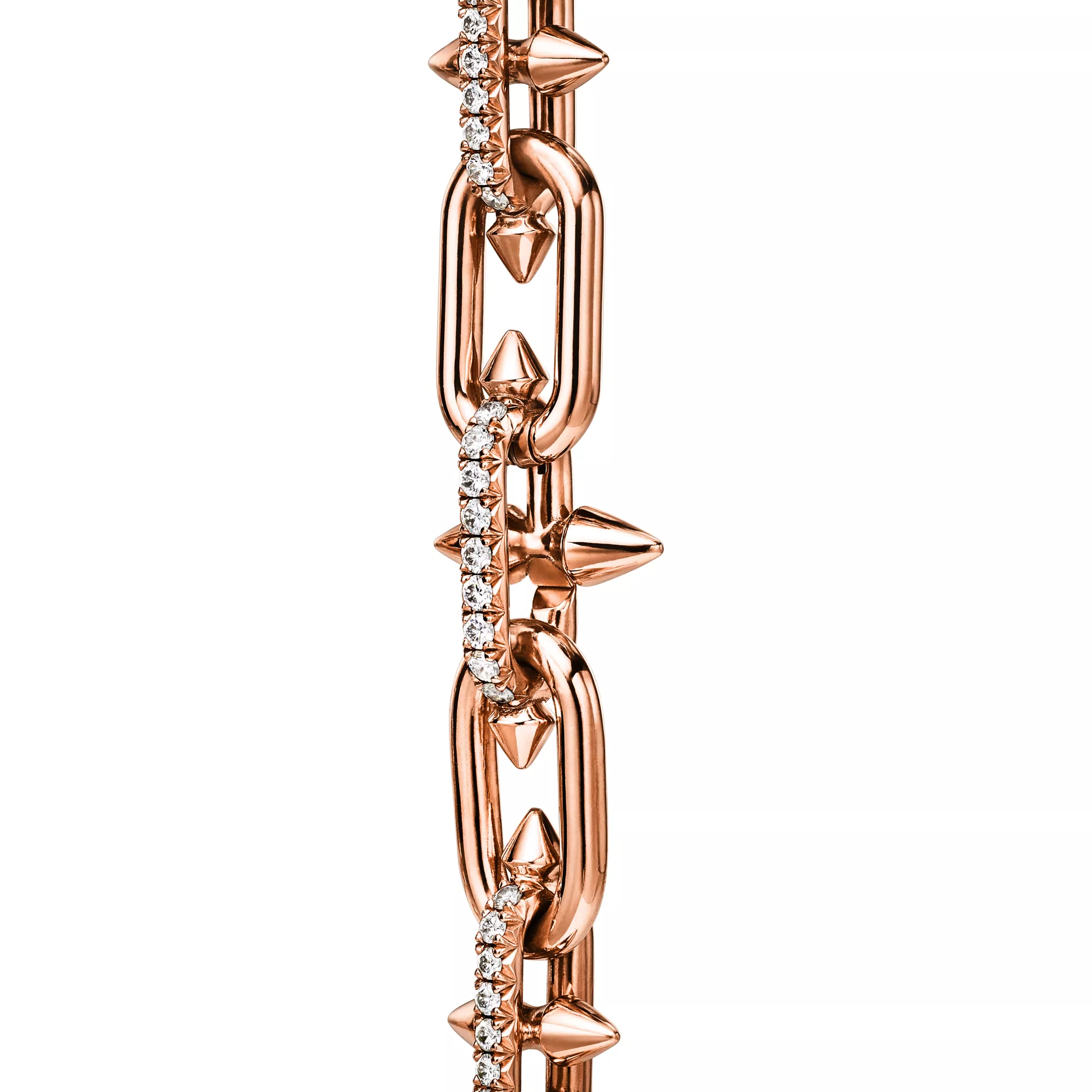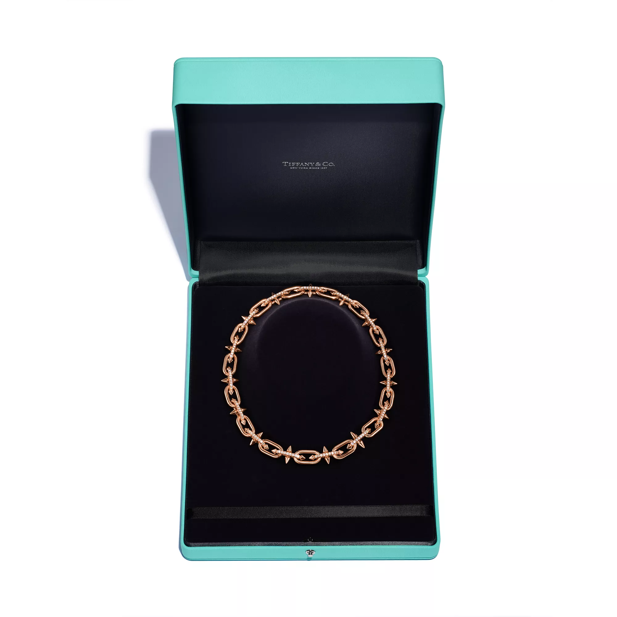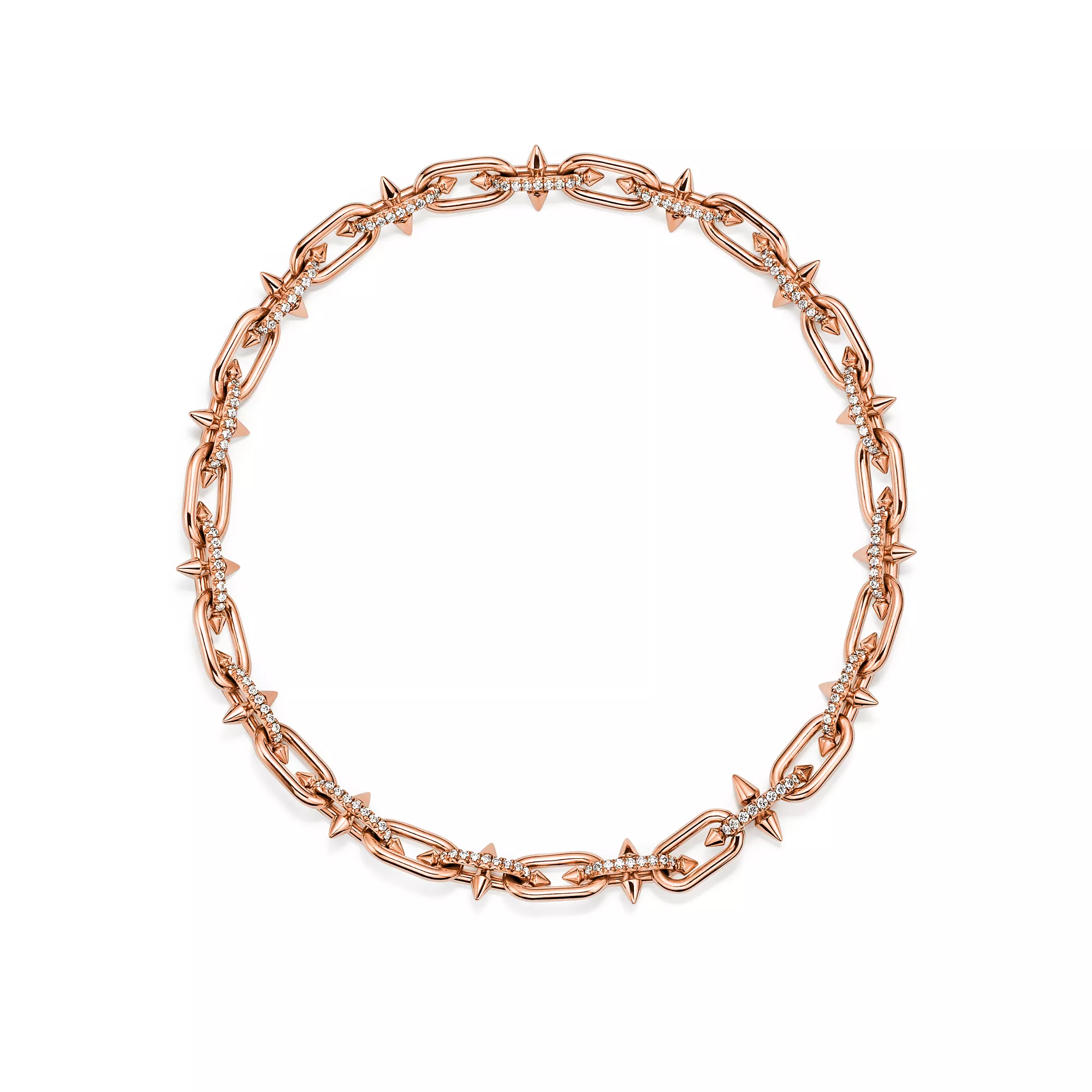 Building on the House’s legacy of collaborating with visionary artists, Tiffany Titan by Pharrell Williams is an expression of rebellion as a catalyst for creativity. These designs draw inspiration from Poseidon and his trident. An angular spear-shaped motif and softly contoured links are crafted from 18k rose gold for a striking look. Fishtail-set pavé diamonds allow light to enter from every angle, maximising brilliance.