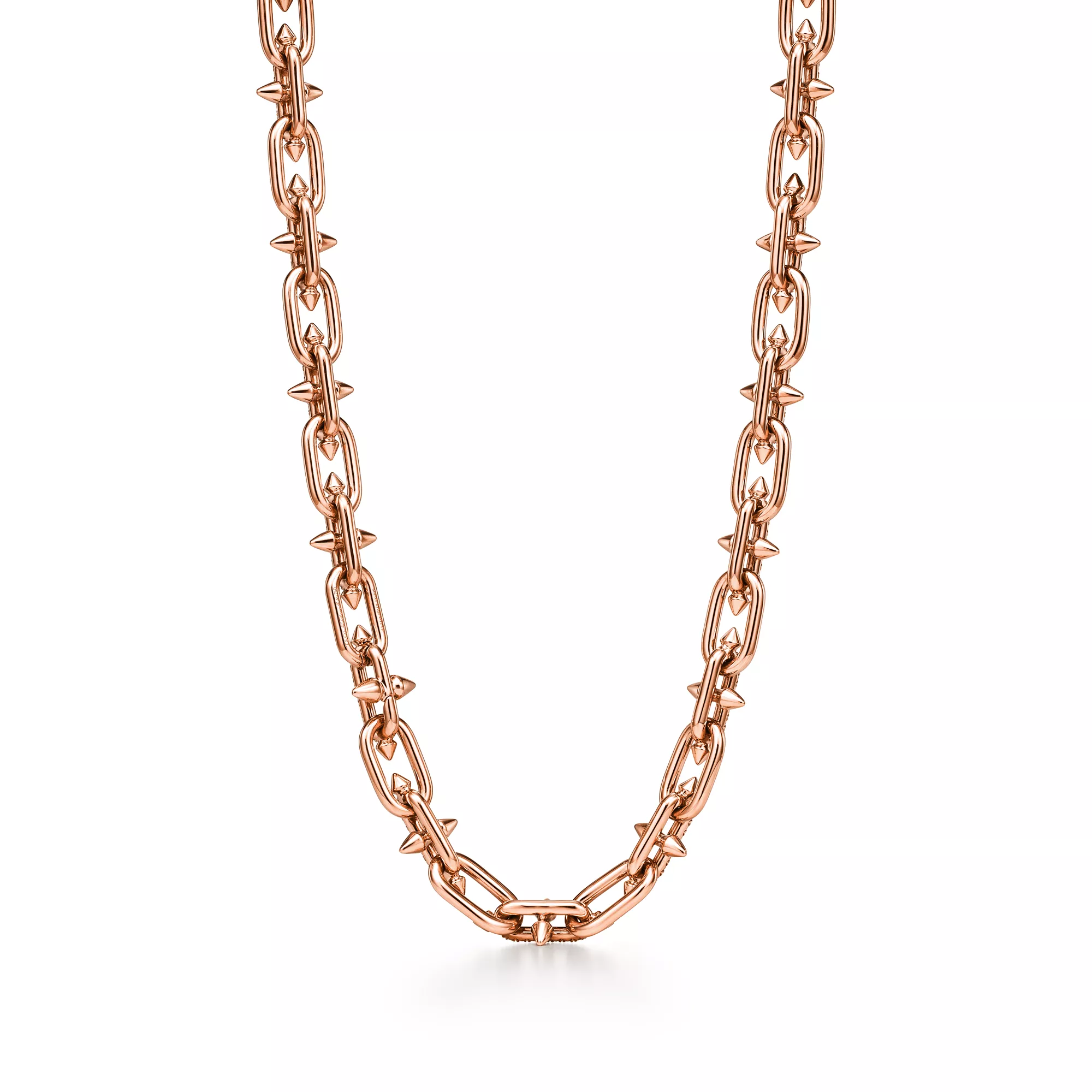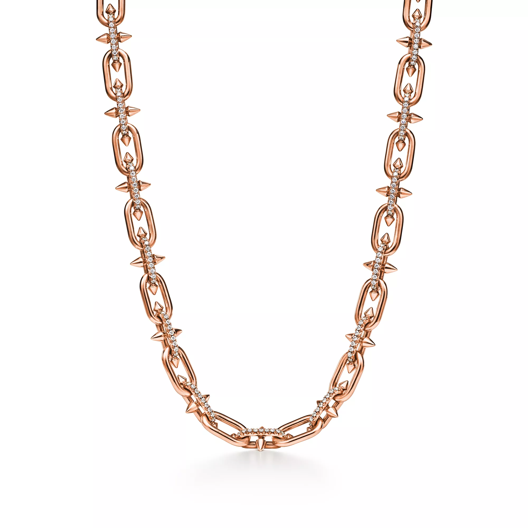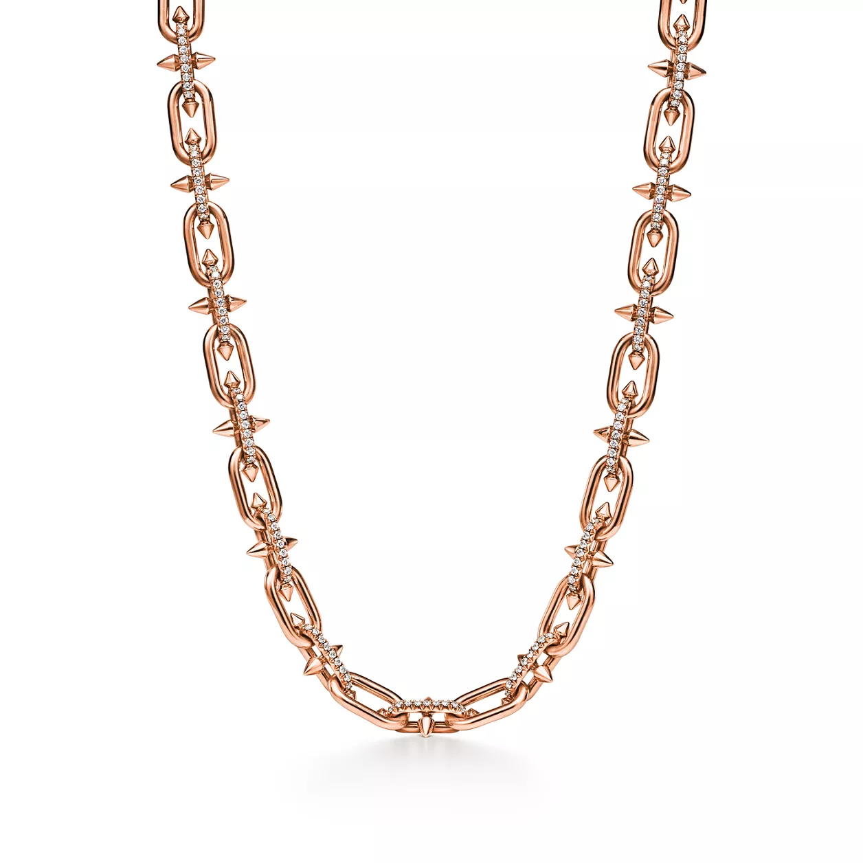 Building on the House’s legacy of collaborating with visionary artists, Tiffany Titan by Pharrell Williams is an expression of rebellion as a catalyst for creativity. These designs draw inspiration from Poseidon and his trident. An angular spear-shaped motif and softly contoured links are crafted from 18k rose gold for a striking look. Fishtail-set pavé diamonds allow light to enter from every angle, maximising brilliance.